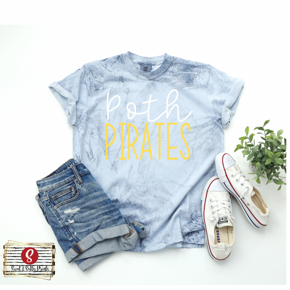 Ahoy, matey! Introducing the Poth Pirates Script - the ultimate casual tee for those who love to embrace their pirate spirit. Made with 100% ring-spun cotton, this shirt is garment dyed for a lived-in feel and almost no shrinkage at home. The soft ring spun color blast fabric with 100% cotton threads provides a comfortable and relaxed fit, perfect for navigating the high seas or simply kicking back at home. Embrace your inner pirate with the Poth Pirates Script, available now at our Spirit shop!